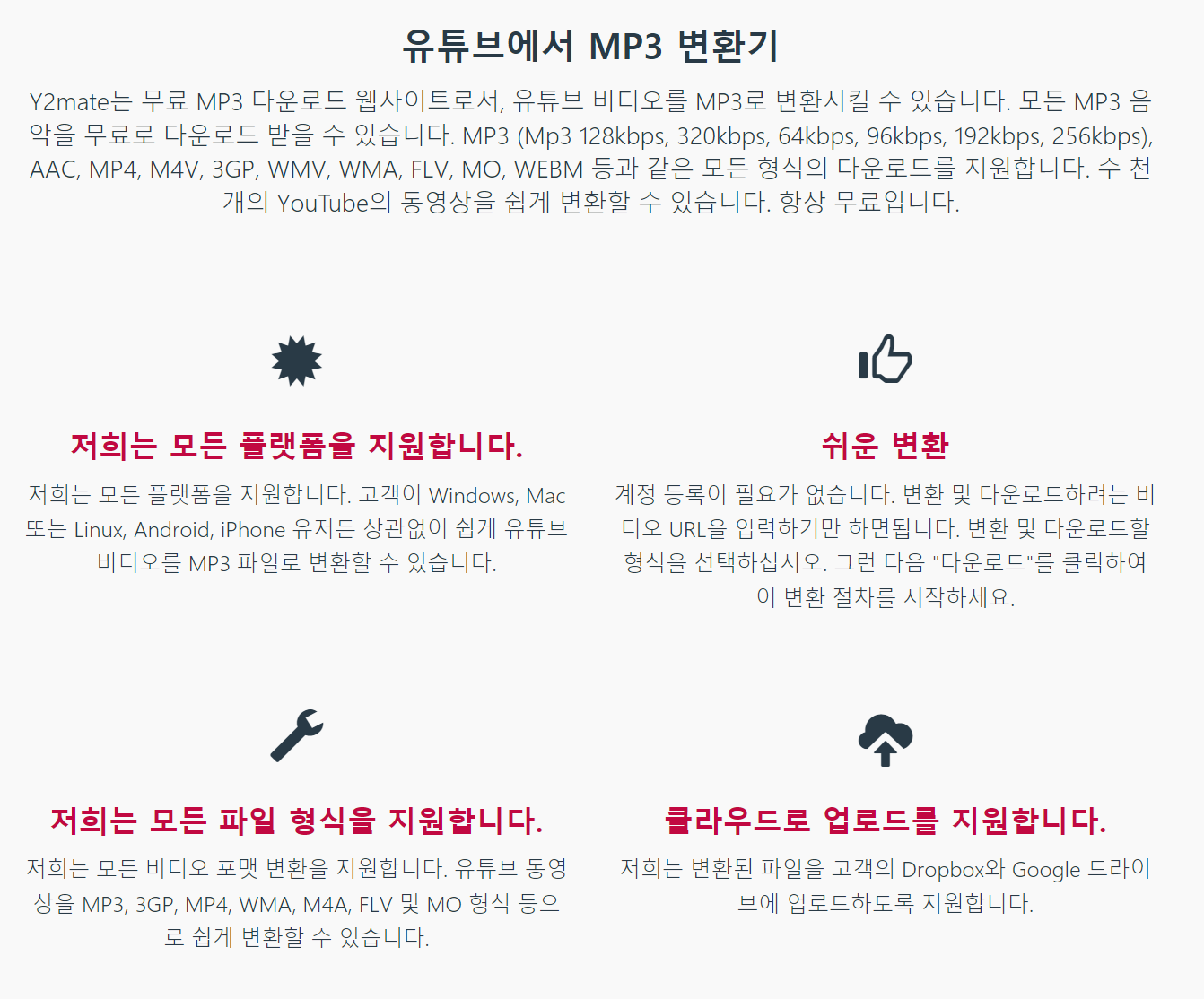 유튜브 음원 추출 뿐만 아니라 MP3, 3GP, MP4, WMA 등 모든 형식의 파일로 변환이 가능하기 때문에 음원 뿐만 아니라 유튜브에 있는 영상도 다운받을 수 있습니다. 별도의 계정을 만들 필요도 없고 PC는 물론이고 안드로이드, 아이폰 등 모든 디바이스에서 사용이 가능합니다.
