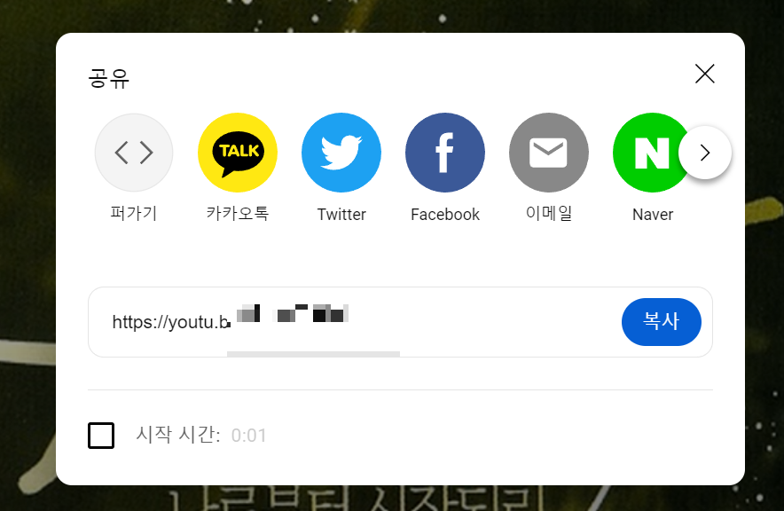 pc 버전에서는 브라우저 주소창을 복사하면 되겠지만 모바일에서는 번거로울 수 있어요. 영상의 하단에 공유 버튼을 눌러서 url을 복사해 주시면 간단하고 편리합니다.