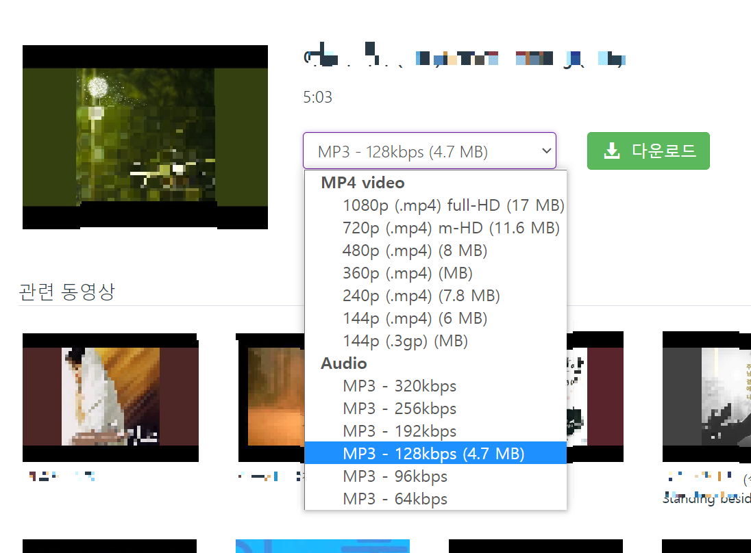 이부분에서 유튜브 음원 추출을 하기 위해 MP4 비디오 형식으로 다운로드 할지, MP3 오디오 파일로 다운로드 할지 선택하시면 되겠습니다. 저는 음원 추출을 위해 mp3를 선택했습니다.