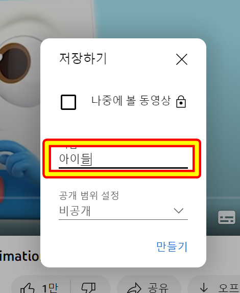 아이들이 자주보는 영상만 모아보기위해 아이들이라고 이름을 지어봤어요. 그리고 우측 하단에 만들기를 눌러주세요. 그럼 재생목록이 만들어진거에요.