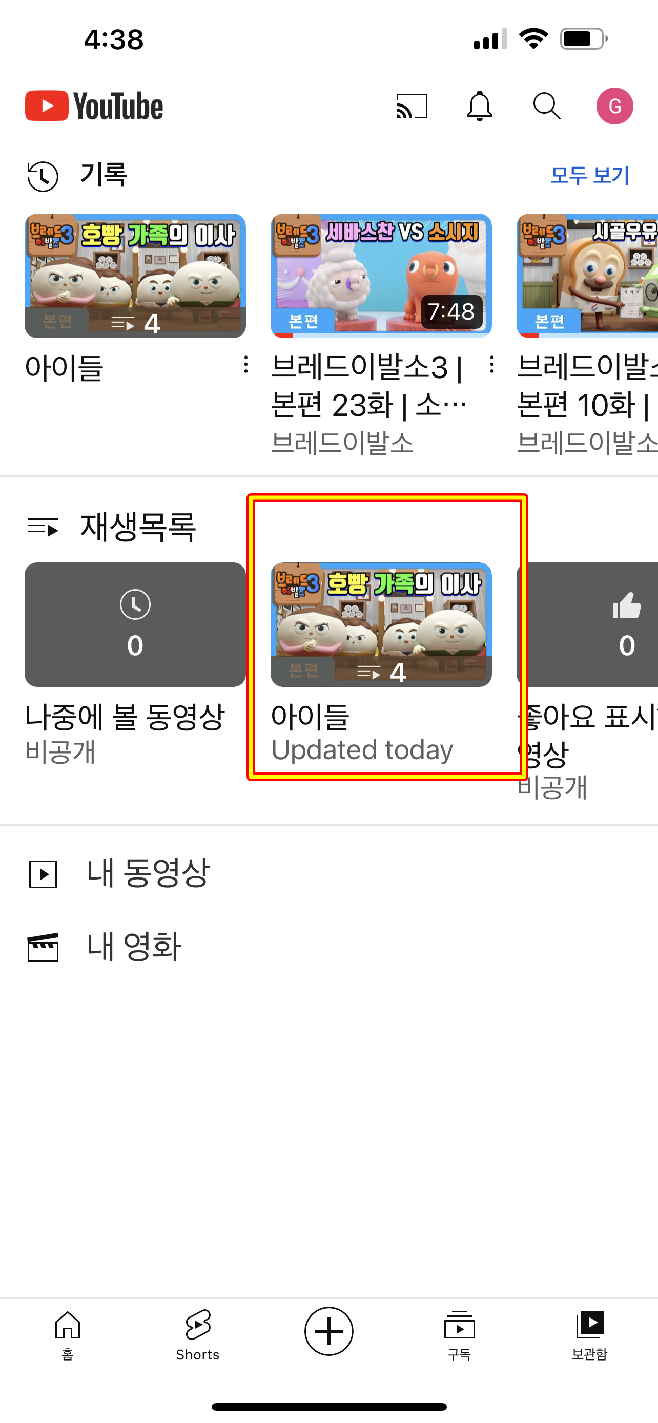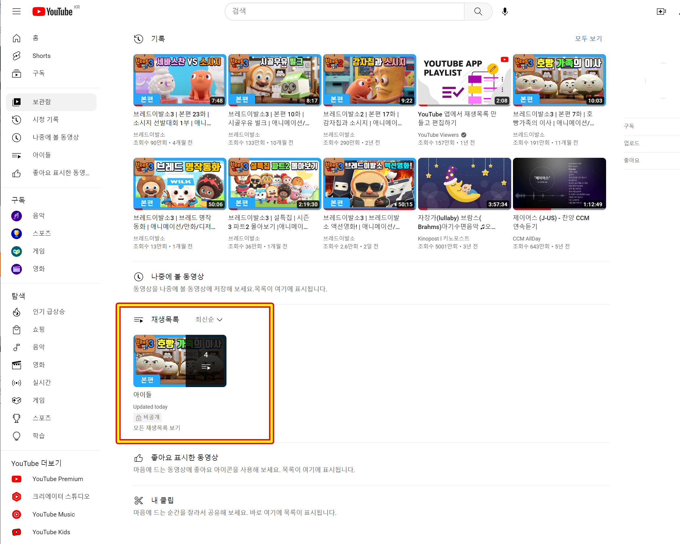 그럼 중간쯤에 저장한 동영상들의 재생목록이 보이실거에요. 눌러서 들어가세요.
