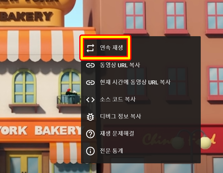 먼저 한편을 반복재생하는 방법은 유튜브 플레이어에 마우스 오른쪽 버튼을 눌러보면 최상단에 보이는 연속재생 버튼을 눌러주면 현재 재생중인 영상이 반복하여 재생됩니다.