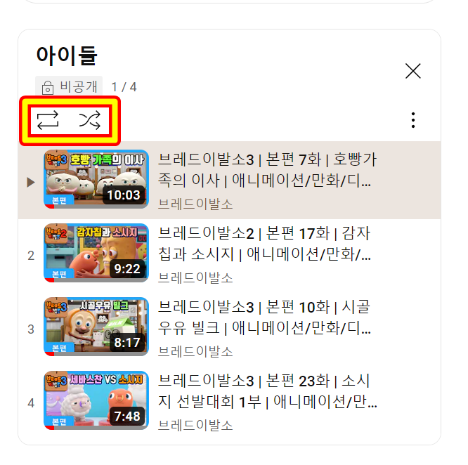 상단에 보시면 반복재생 버튼과 셔플(무작위) 재생 버튼이 보이시죠? 여기서 선택해주시면 재생목록에 저장된 동영상 안에서 반복재생도 가능하고 무작위 재생도 가능합니다.