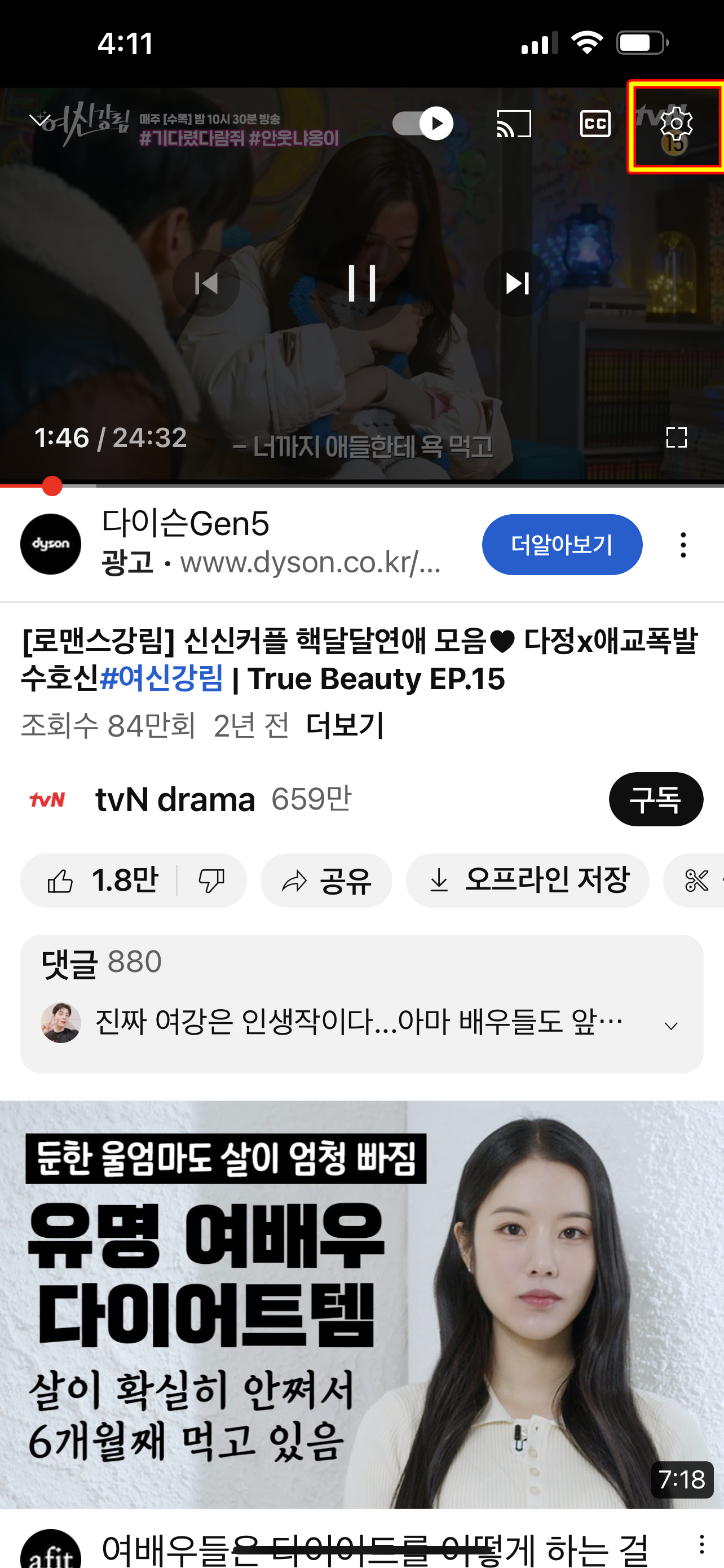 모바일 버전으로는 재생중인 동영상 우측 상단에 설정버튼을 눌러주시면 동영상 연속 재생이라는 버튼이 보이실거에요. 요걸 사용함으로 바꿔주면 1개의 동영상이 연속으로 재생됩니다.