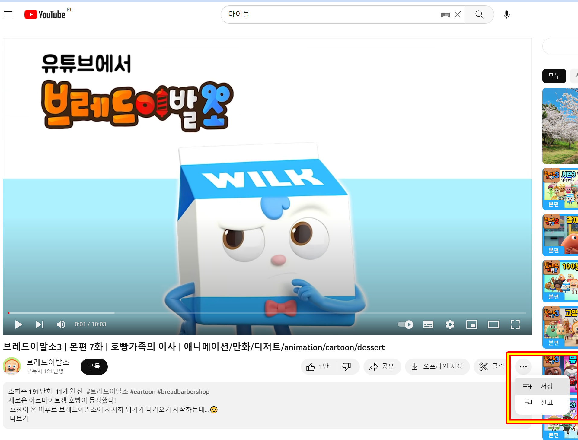 재생 목록에 추가할 영상에서 우측 하단의 ...을 누르시고 저장을 눌러주세요.