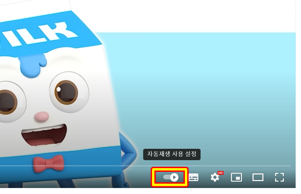 PC 버전의 경우 유튜브 영상 화면의 우측 하단에 자동재생 사용 설정 버튼이 있습니다. 우측으로 두면 사용 좌측으로 두면 사용 중지되는 버튼입니다.