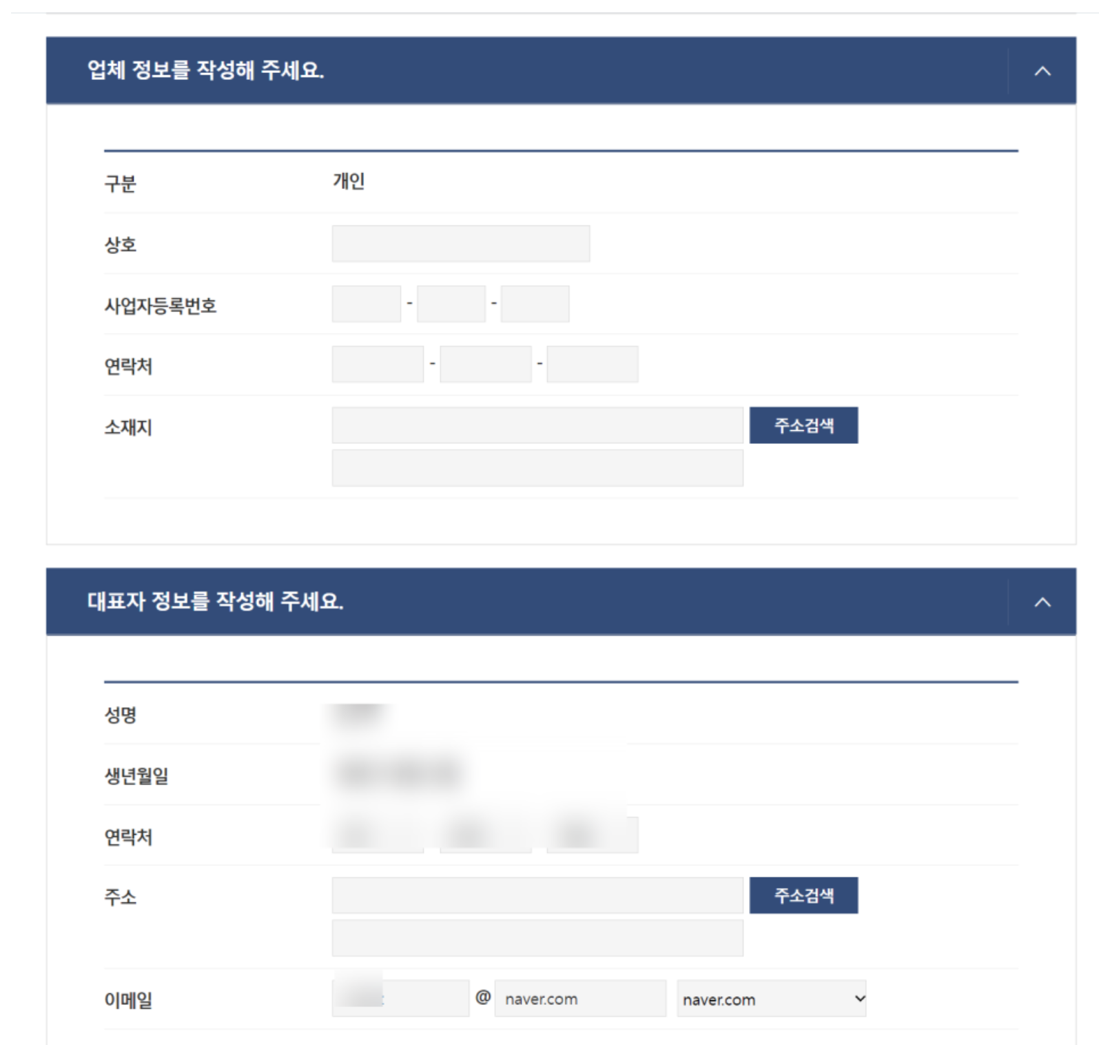 스크롤을 내려 업체와 대표자의 정보를 입력해 주시고 더 내리면 구비서류를 제출하는 파일첨부란이 보이실 거예요.